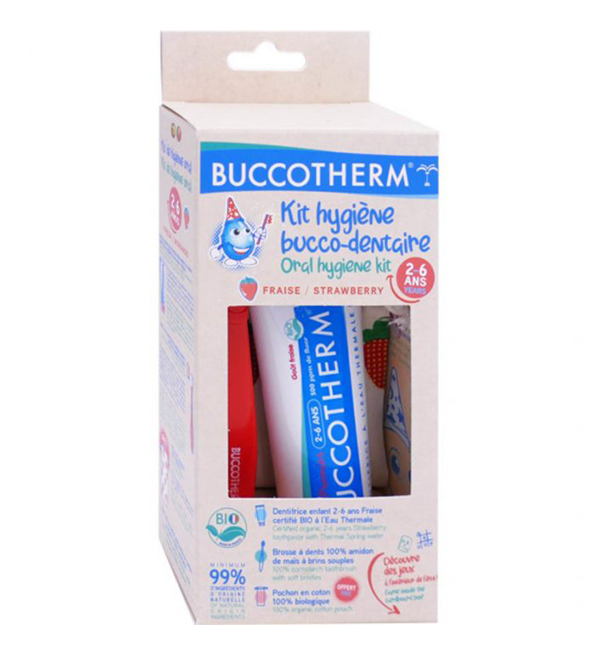 Le Buccotherm Kit Enfant 2-6 ans contient un dentifrice Bio au goût fraise, formulé à base d’eau thermale et sans fluor, pour respecter les dents de lait. Son arôme gourmand facilite l’apprentissage du brossage chez les tout-petits.