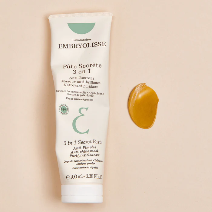 La Pâte Secrète 3 en 1 Embryolisse est le soin anti-imperfections multi-fonctions. Dans sa formule, à 98% d’ingrédients d’origine naturelle, on retrouve du Curcuma Bio, Poudre de pois chiche et Argile jaune qui améliorent la qualité et l’éclat de la peau.