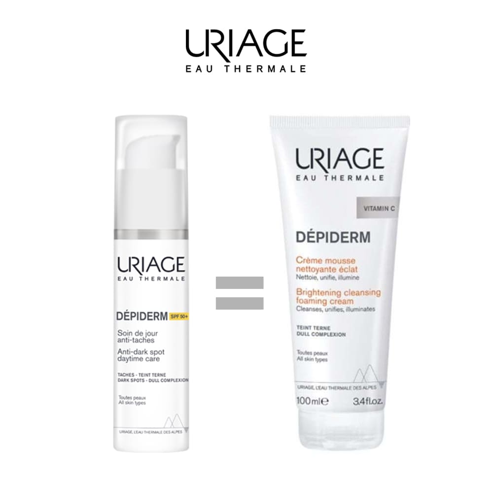 Le Coffret Uriage Dépiderm associe deux soins complémentaires pour prévenir et corriger les taches brunes tout en illuminant le teint :