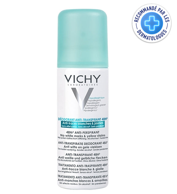 Le Déodorant Spray Anti-Traces 48H de Vichy protège contre la transpiration et neutralise les odeurs pendant 48 heures. Sa formule anti-traces préserve la couleur des vêtements. Convient aux peaux sensibles.