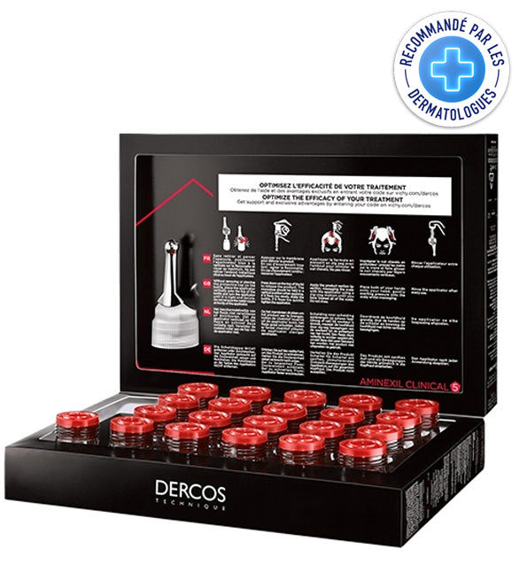 Le Traitement Anti-Chute Dercos Aminexil Clinical 5 pour hommes de Vichy cible la chute de cheveux persistante. Enrichi en Aminexil, arginine, vitamine PP et complexes fortifiants, il renforce les racines, stimule la microcirculation du cuir chevelu et ralentit la chute. Cure de 21 ampoules.